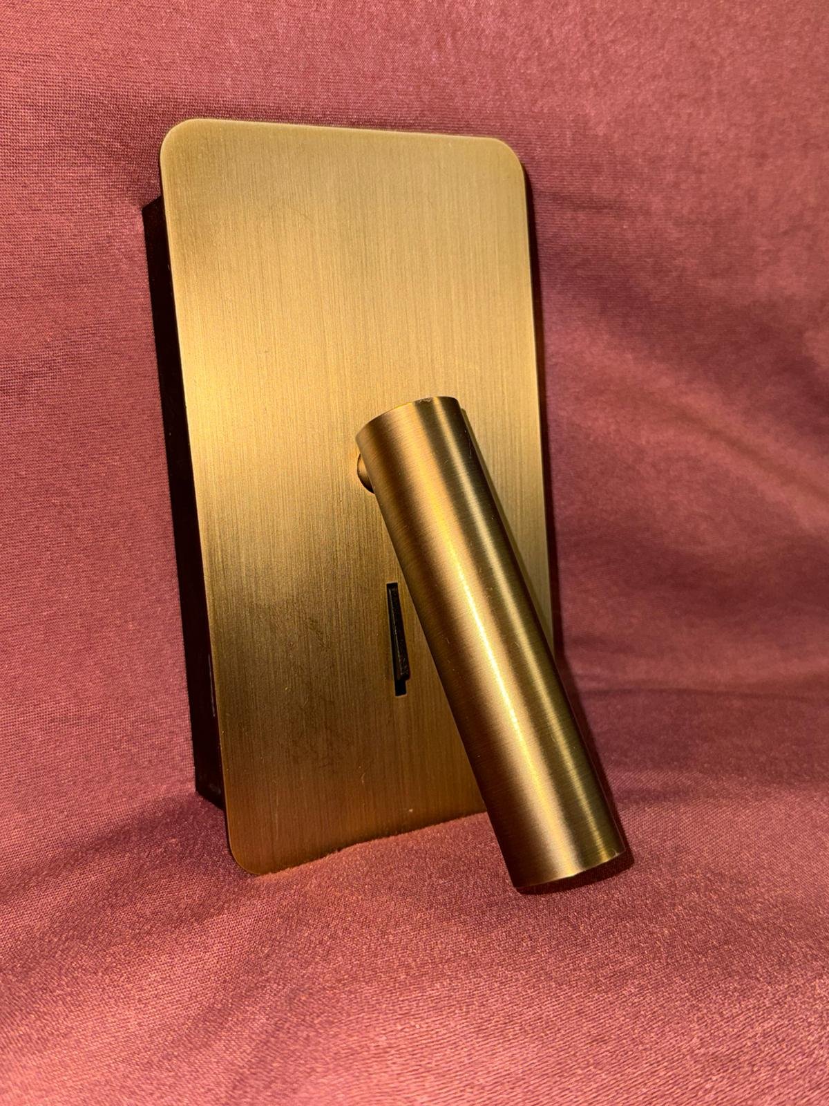 Aplique de pared nuevo con estructura metálica en acabado dorado y diseño minimalista, que incorpora iluminación para un uso funcional. Su formato compacto aporta un estilo discreto y elegante.