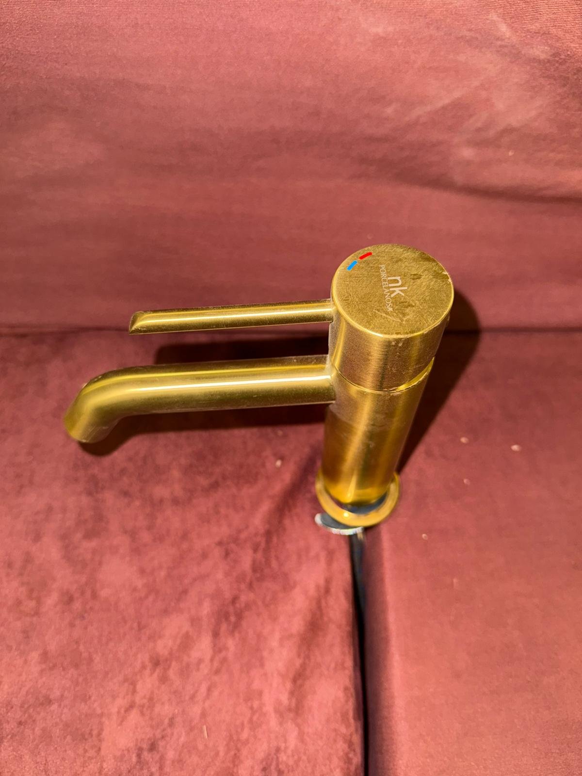 Grifo monomando de la marca Porcelanosa nuevo con acabado dorado y diseño compacto, que aporta un estilo elegante y actual. Su formato sencillo lo hace práctico y fácil de integrar.