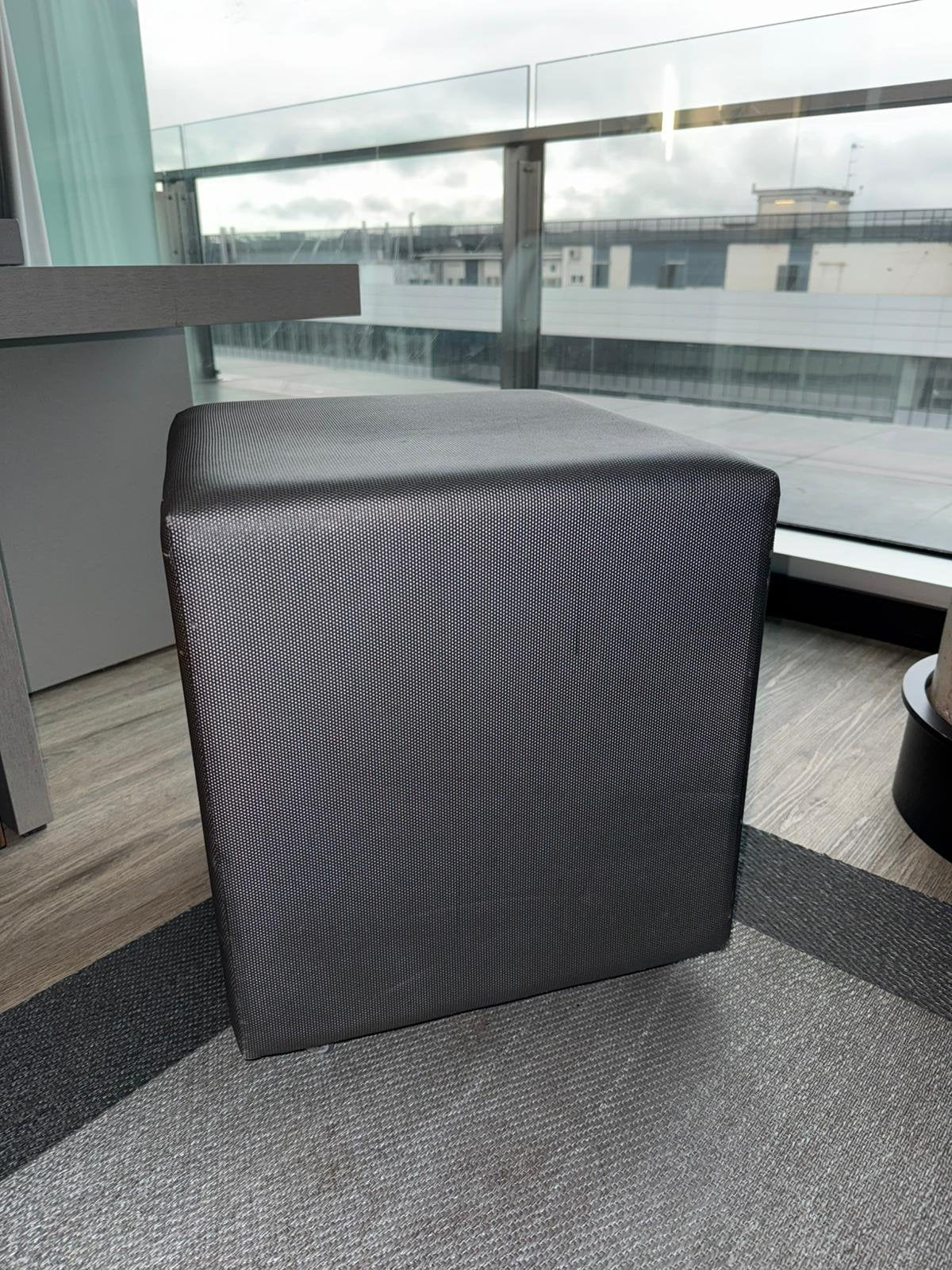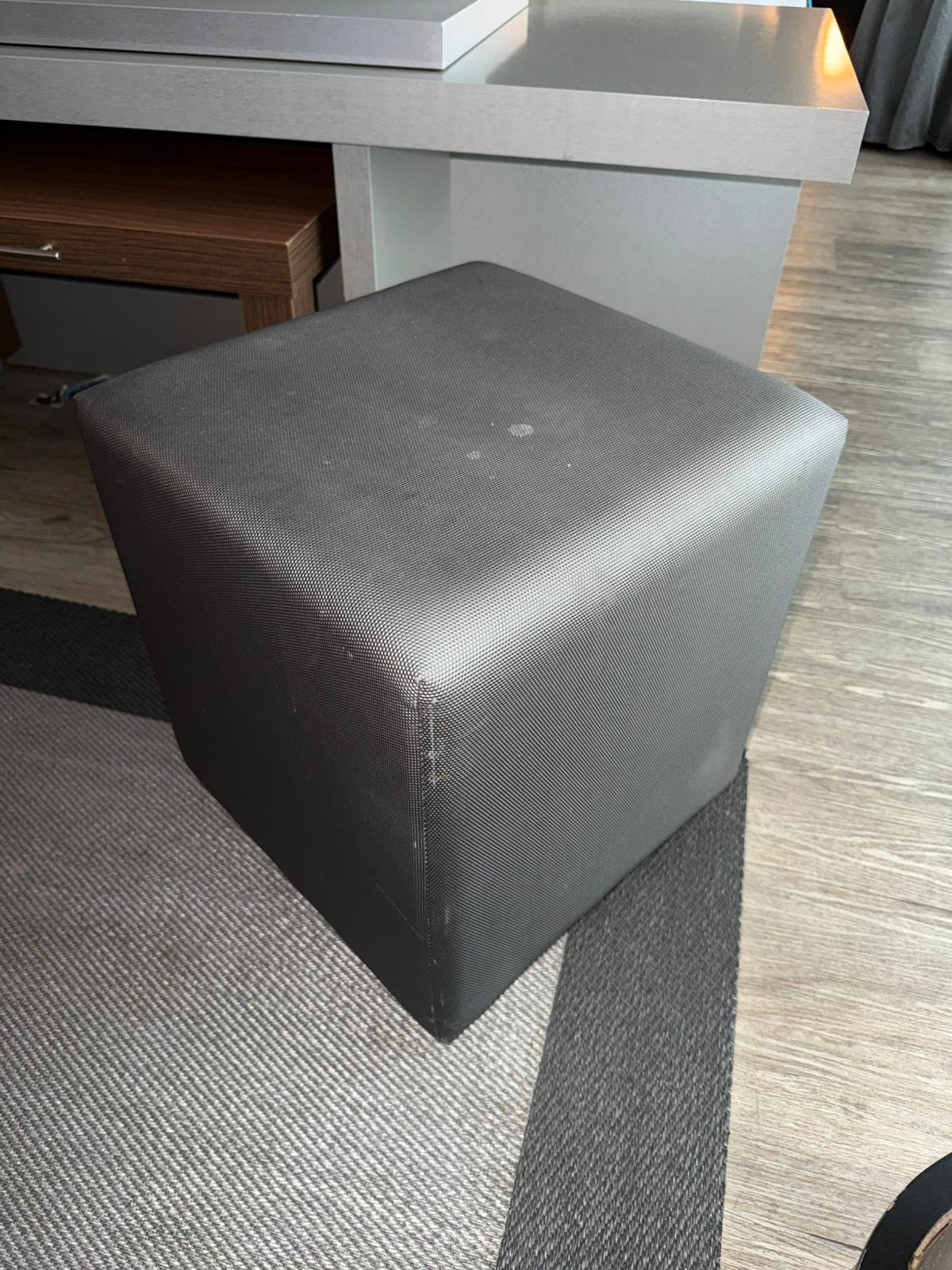 Puf cuadrado tapizado en acabado oscuro, con diseño sencillo y formato compacto. Su estructura firme lo convierte en una pieza práctica y fácil de integrar en distintos espacios.